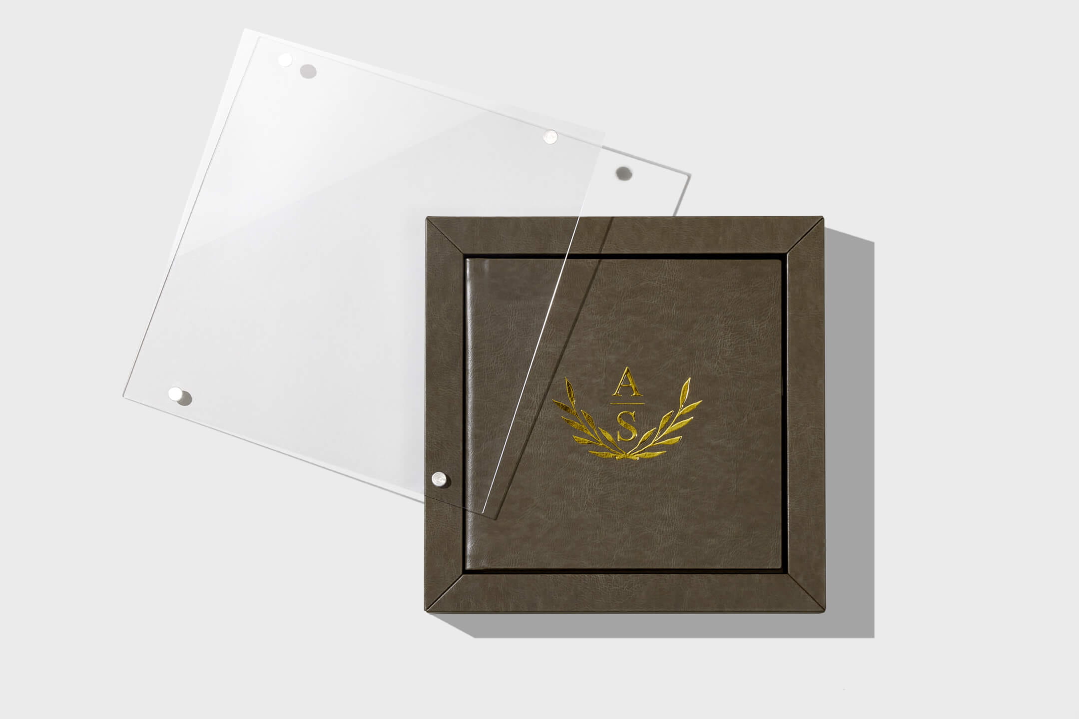 This two piece box design includes acrylic lid and a box base in cover materials of choice. Select the same material to match the album or a different color to accent the album. Complete the look with a ribbon color that complements the design.