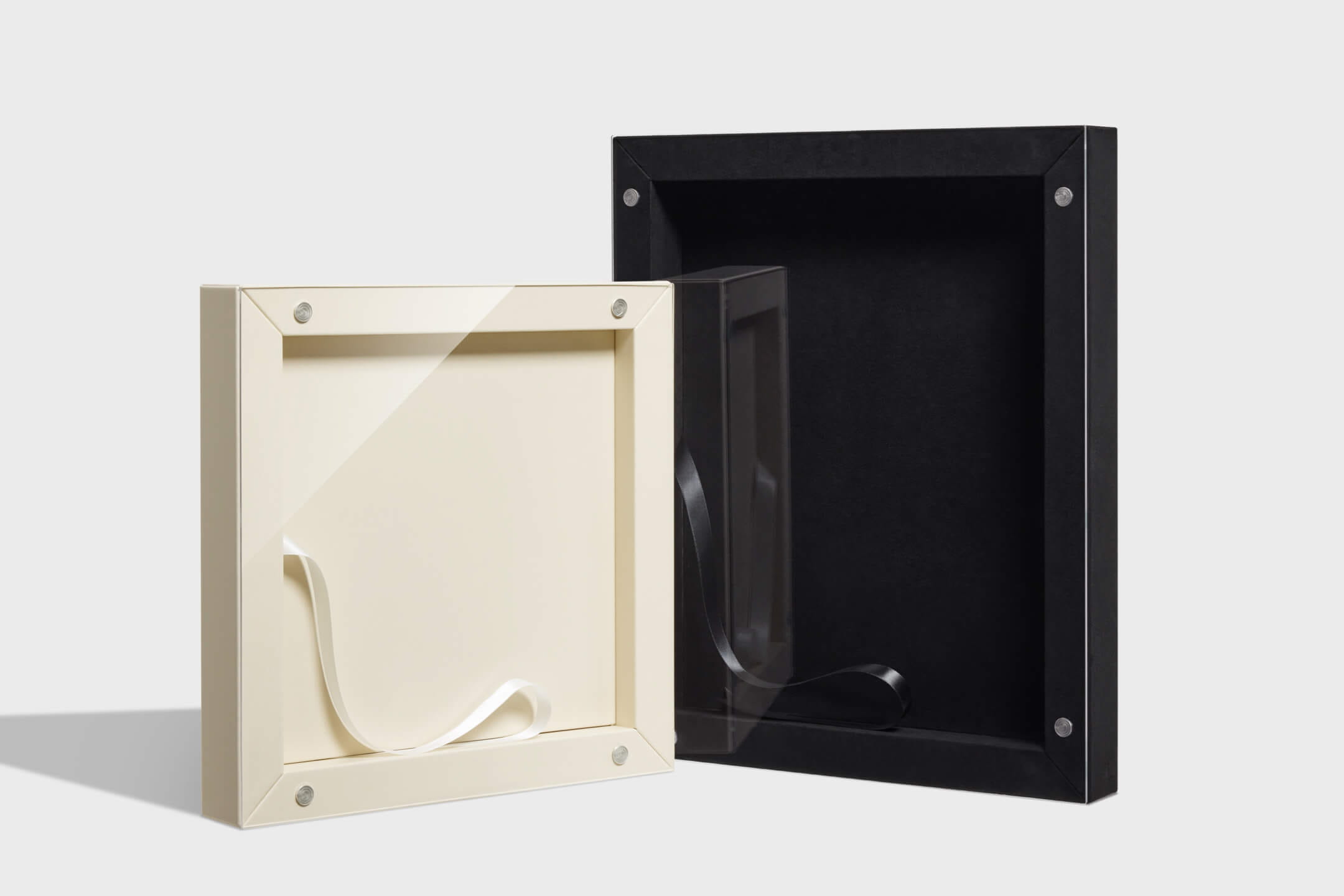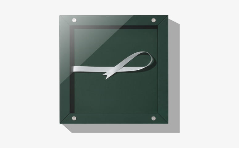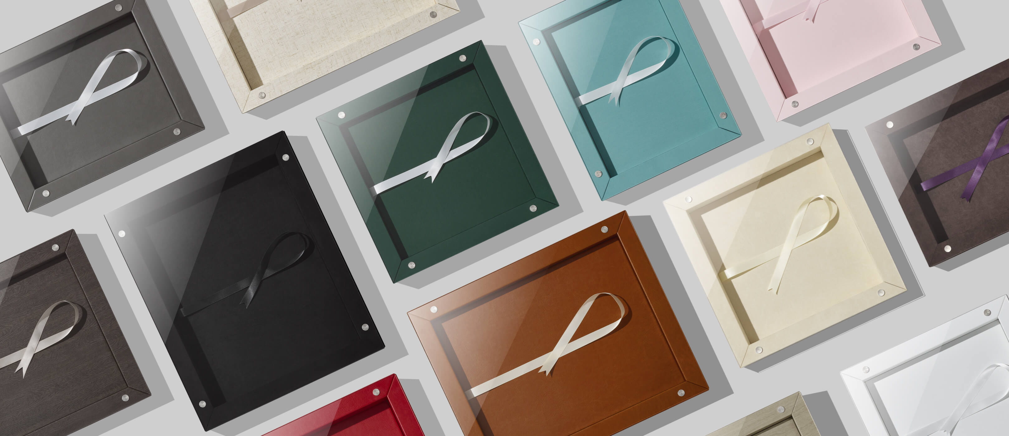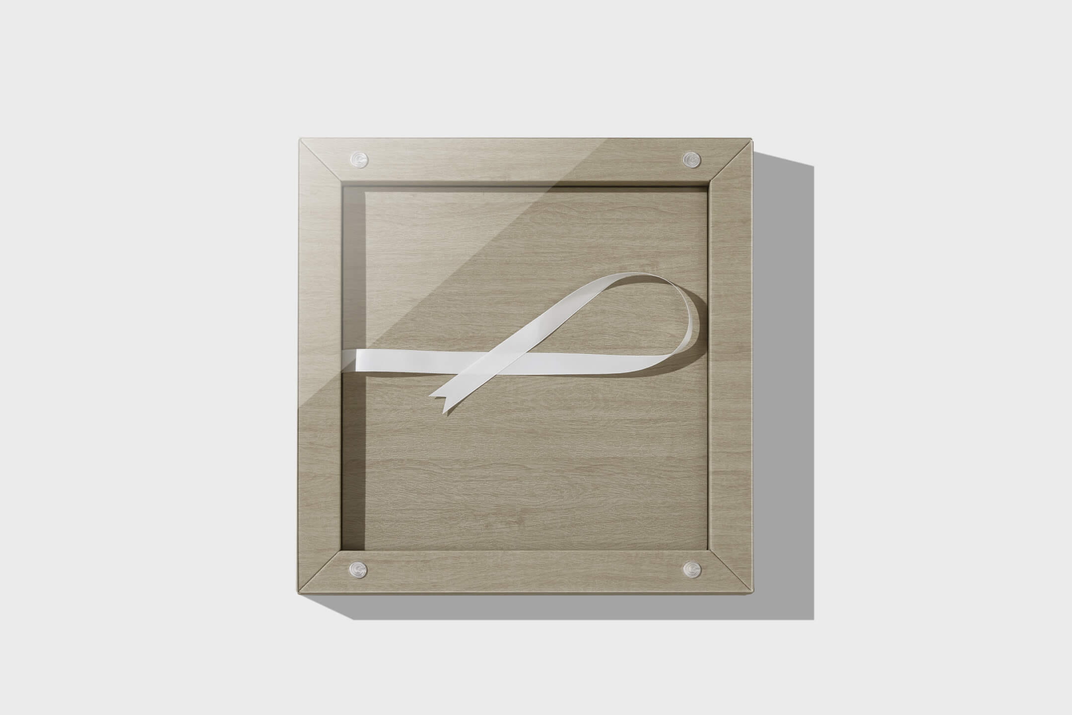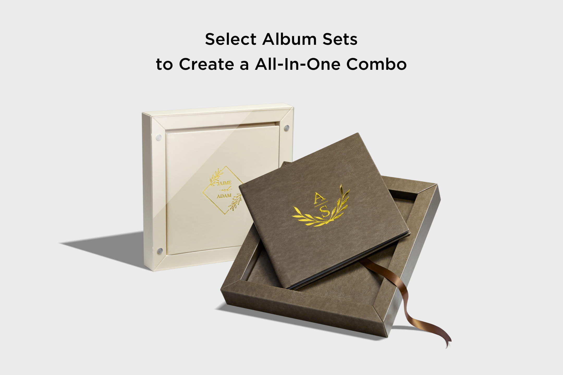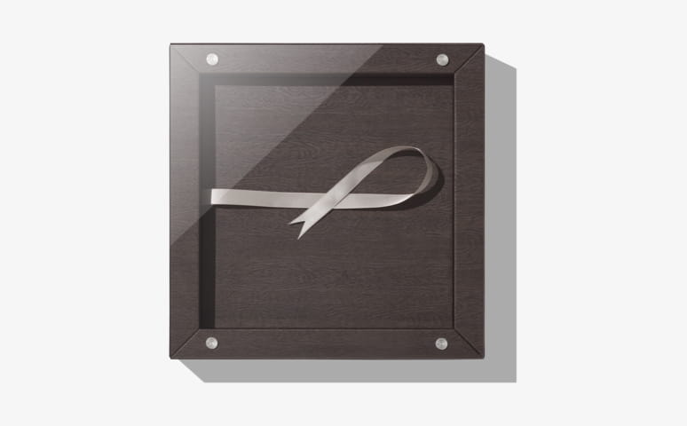 This two piece box design includes acrylic lid and a box base in cover materials of choice. Select the same material to match the album or a different color to accent the album. Complete the look with a ribbon color that complements the design.