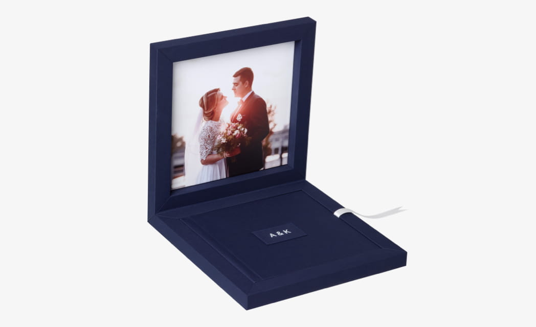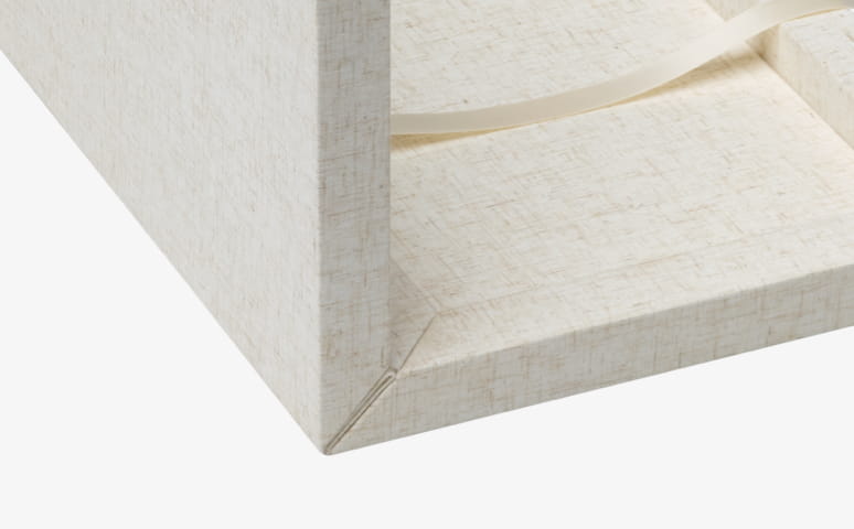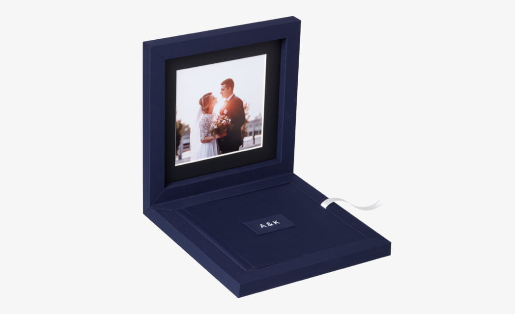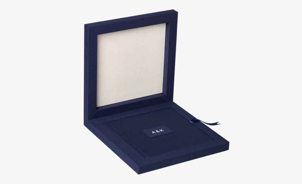 This box is fully customizable, with your choice of cover material and ribbon. The inside panel offers the option of displaying a print for a personalized touch. For an enchanting display, an optional stand is available to support a standing lid design that elevates the presentation.