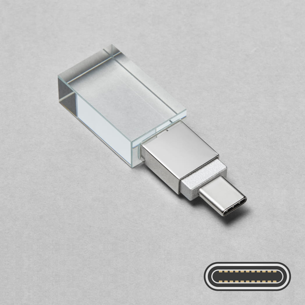 The Crystal USB Drive consists of a polished metal or wood cap with glass see-through body.